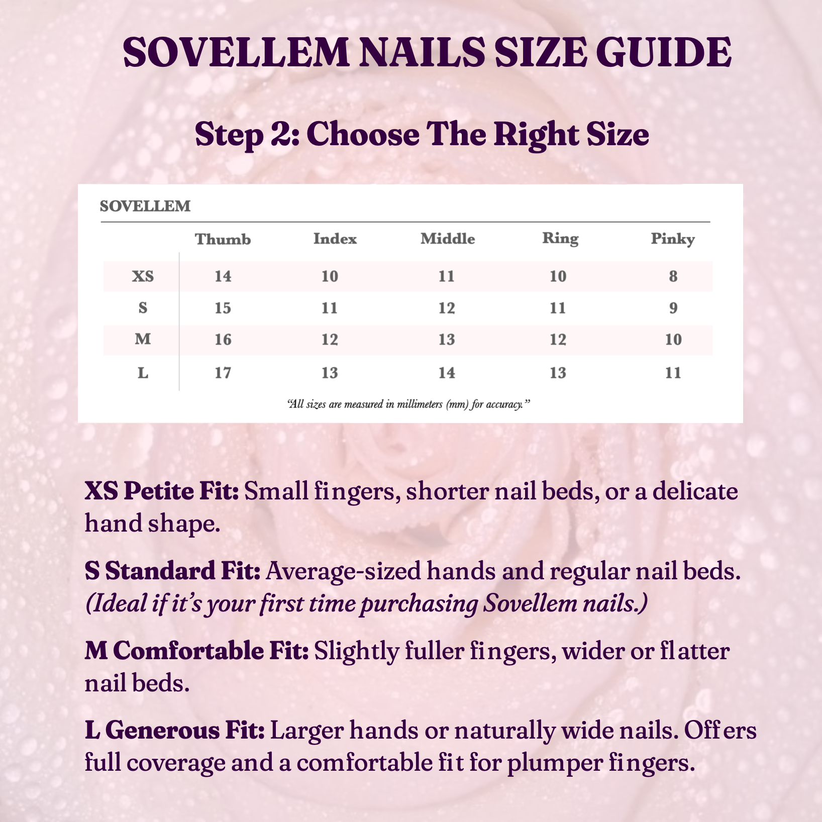 Best for most people with average-sized hands and regular nail beds. Ideal if it’s your first time purchasing Sovellem nails.